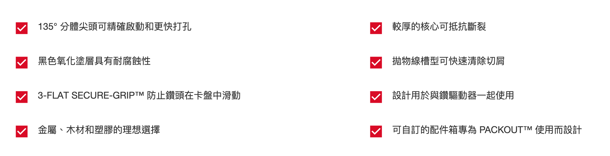 我們的 MILWAUKEE® THUNDERBOLT® 15 件組黑色氧化物鑽頭套件可在作業現場提供重型性能。黑色氧化物塗層可減少熱量累積並提供耐腐蝕性。較厚的核心提供了終極強度並防止側向負載斷裂,而專門設計的拋物線槽形式可快速清除切屑和碎片以保持鑽頭涼爽。 135° 分叉點尖端提供精確的啟動並防止快速、準確的孔移動。 MILWAUKEE® THUNDERBOLT® 黑色氧化物塗層鑽頭非常適合木材、塑膠和金屬的各種鑽孔應用。該套件收納在一個可自訂的配件箱中,專為 PACKOUT™ 使用而設計。